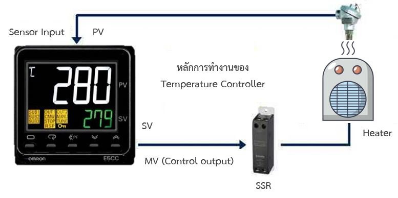 ในการทำงานของ Temperature Controller นั้น จะเริ่มต้นที่การตั้งค่าที่ส่วนของ SV ซึ่งเป็นการระบุว่าเราต้องการควบคุมอุณหภูมิที่กระบวนการผลิตเท่าไร เช่น ตั้งไว้ 500ºC จากนั้นตัวควบคุมอุณหภูมิ ก็จะทำการเปรียบเทียบ หรือ หาผลต่างระหว่างค่า PV กับ SV ซึ่งค่า PV จะได้จากการอ่านค่า Sensor Input ซึ่งถ้าค่า PV น้อยกว่า SV ก็จะสั่งให้ Control Signal Output จ่ายสัญญาณออกไปผ่าน SSR ที่เปรียบเสมือนสวิตช์ เพื่อเร่งให้ตัว Heater ทำงานให้ร้อนขึ้น เมื่ออุณหภูมิที่ค่า PV มากกว่า SV ก็จะทำการลดค่า Control Signal Output ลงเพื่อให้ Heater ทำงานน้อยลง โดยกระบวนการควบคุมนี้เป็น พื้นฐานการควบคุมแบบหนึ่งที่เรียกว่า การควบคุมแบบ On-Off Control