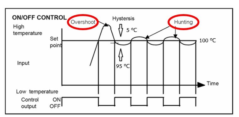 ซึ่งในการควบคุมแบบ ON/OFF ทั้งการตัด/ต่อเอาต์พุต จะทำอยู่รอบๆ ค่า setpoint เช่น ค่า setpoint เท่ากับ 100°C เอาต์พุตจะตัดที่ 100°C และจะต่อทันทีเมื่ออุณหภูมิต่ำกว่า 100°C ในกรณีที่เอาต์พุตเป็นแบบหน้าสัมผัส การตัดต่อด้วยความถี่สูงๆ จะทำให้หน้าสัมผัสเสื่อมสภาพเร็ว หรือเกิดการอ๊าคติดกัน ค่า Hysteresis เป็นค่าที่ใช้ตั้งเพื่อกําหนดให้เอาต์พุตที่ตัดที่จุด setpoint แล้วนั้น กลับมาต่อเมื่ออุณหภูมิต่ำกว่า setpoint เท่าใด (ในกรณีควบคุมความร้อน) ตัวอย่างเช่น ถ้าตั้ง setpoint ไว้ที่ 100°C และตั้งค่า Hysteresis ไว้ที่ 5°C เอาต์พุตจะตัดที่ 100°C และจะกลับมาต่อที่ 95°C เป็นอย่างนี้ไปเรื่อยๆ ทำให้ลักษณะการควบคุมแบบ ON/OFF นี้จะมีค่าอุณหภูมิแกว่งไปมา (Hunting) รอบๆค่า setpoint และจะมี Overshoot ทุกครั้งขณะเริ่มต้นการควบคุม